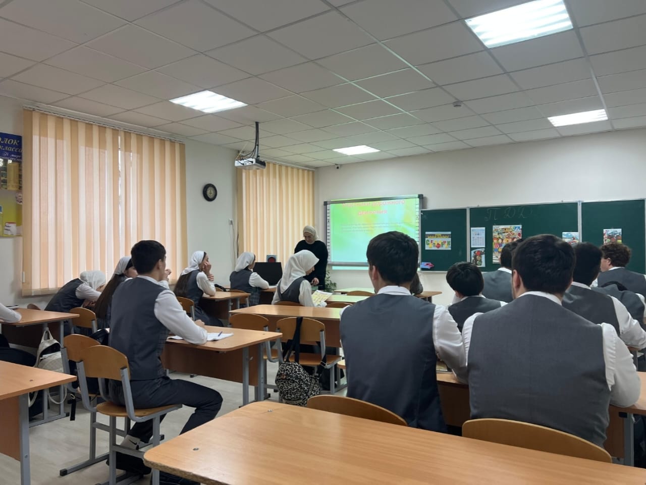 Один из классных часов посетил советник директора по воспитанию и взаимодействию с детскими общественными объединениями Шахбиевой З.О-Х.