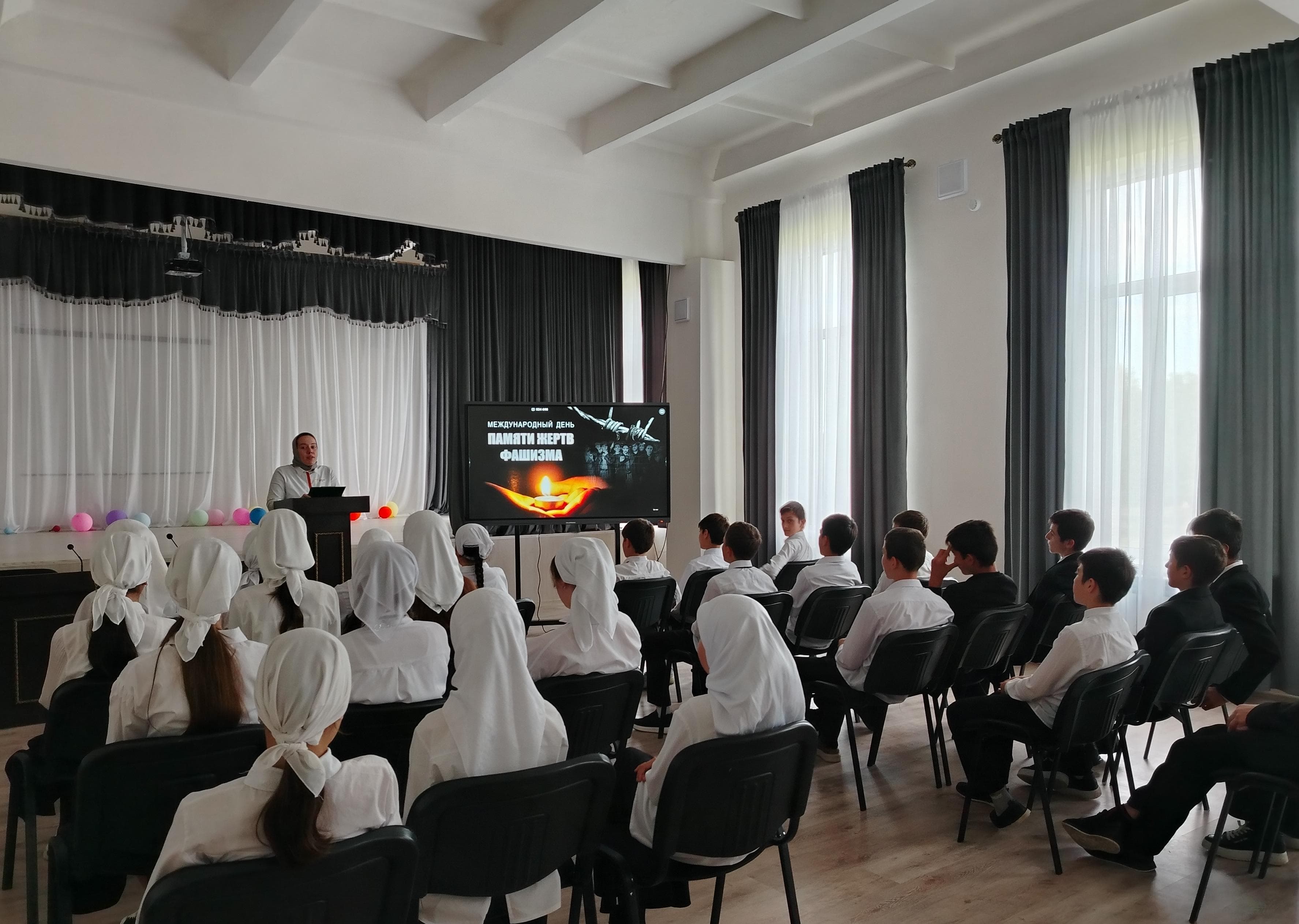 Под руководством советника директора по воспитанию и взаимодействию с детскими общественными объединениями Шахбиевой З. О-Х., обучающиеся 5-8 классов приняли участие в познавательном часе «Жертвы фашизма»