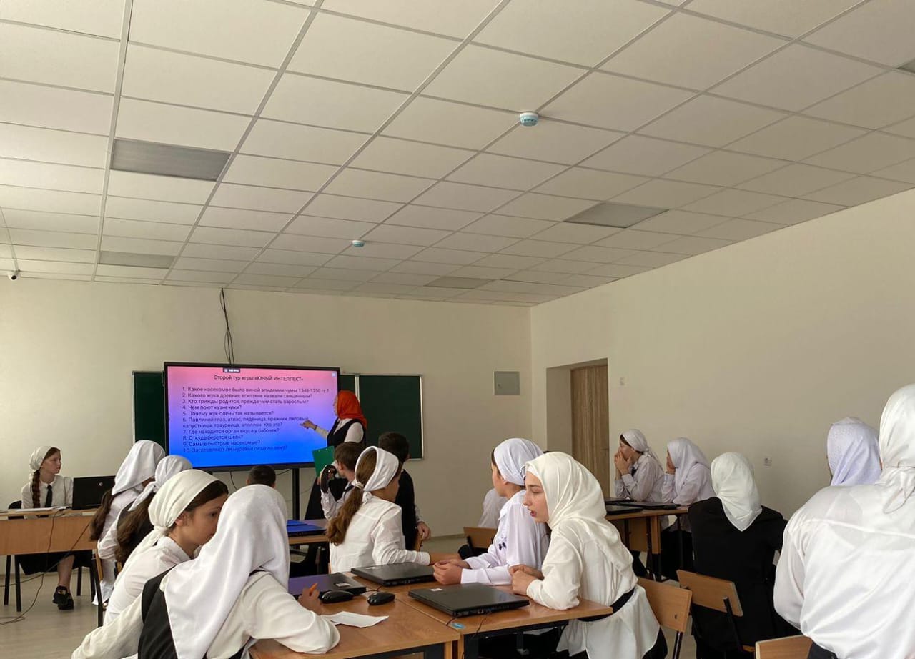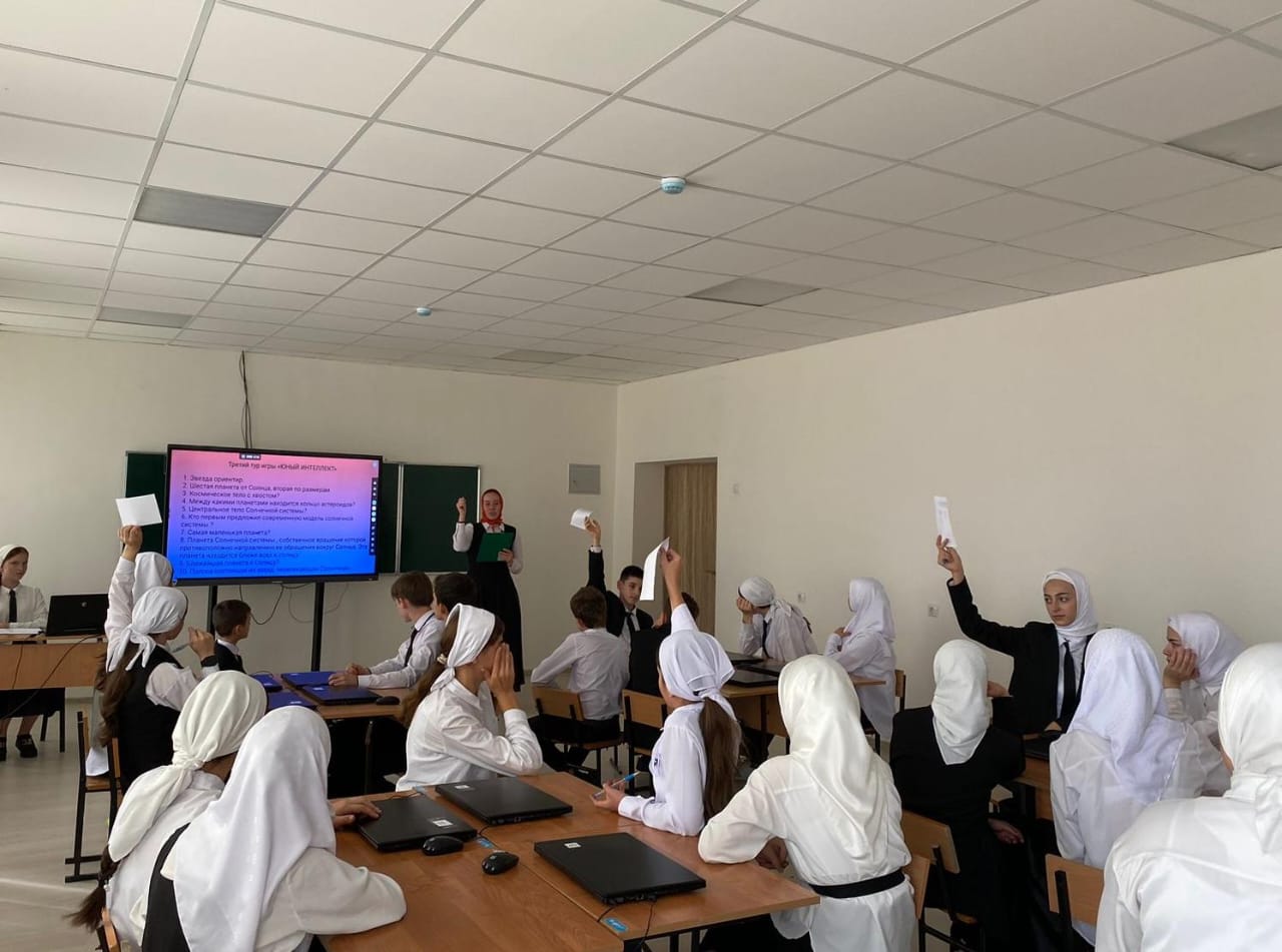 Сегодня обучающиеся 8-9 классов под руководством советника директора по воспитанию и взаимодействию с детскими общественными объединениями Шахбиевой З.О-Х., приняли участие в школьном этапе Чемпионата интеллектуальных игр «Юный интеллект».