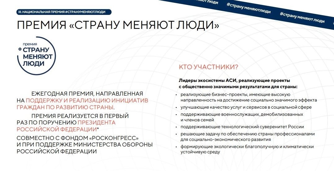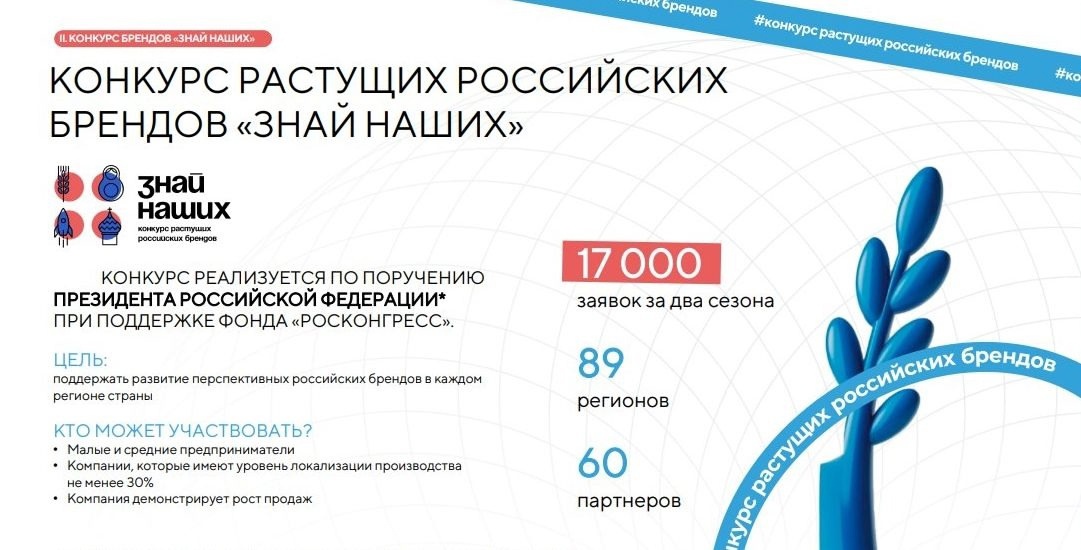 05.05.2025Конкурс «Знай наших». Сезон III – это возможность для российских брендов заявить о себе, получить поддержку и выйти на новый уровень развития. Российский бизнес – это смелость, традиции и инновации. Он направлен на развитие перспективных российских брендов во всех регионах страны. К участию приглашаются представители малого и среднего бизнеса, чьи компании демонстрируют устойчивый рост и высокую степень локализации производства. В третьем сезоне конкурса планируют акцентировать внимание на отборе и продвижении компаний из малых городов, численностью до 100 тыс. человек. Организаторы конкурса – АНО «Агентство стратегических инициатив по продвижению новых проектов» совместно с Фондом «Росконгресс». 💢Также в этом году Агентство совместно с Фондом при поддержке Министерства обороны РФ впервые организует проведение ежегодной премии «Страну меняют люди». Премия реализуется по инициативе и поручению Президента России и впервые пройдет в рамках Форума «Сильные идеи для нового времени», который состоится в Нижнем Новгороде в июле 2025 года. Премия охватит несколько сотен победителей, чьи проекты реализуются в различных сферах: здравоохранение, экология, промышленность, социальное развитие, туризм и другие. Она станет не только наградой, но и инструментом популяризации лидеров изменений, вдохновляя граждан на активное участие в развитии страны. Сбор заявок на Конкурс брендов и Премию «Страну меняют люди» пройдет до 15 мая 2025 на крауд-платформе по ссылке: https://ideas.roscongress.org/. Информация о Конкурсе брендов 2025 года и результатах прошедших Конкурсов брендов размещена на сайте: https://ideas-forum.ru