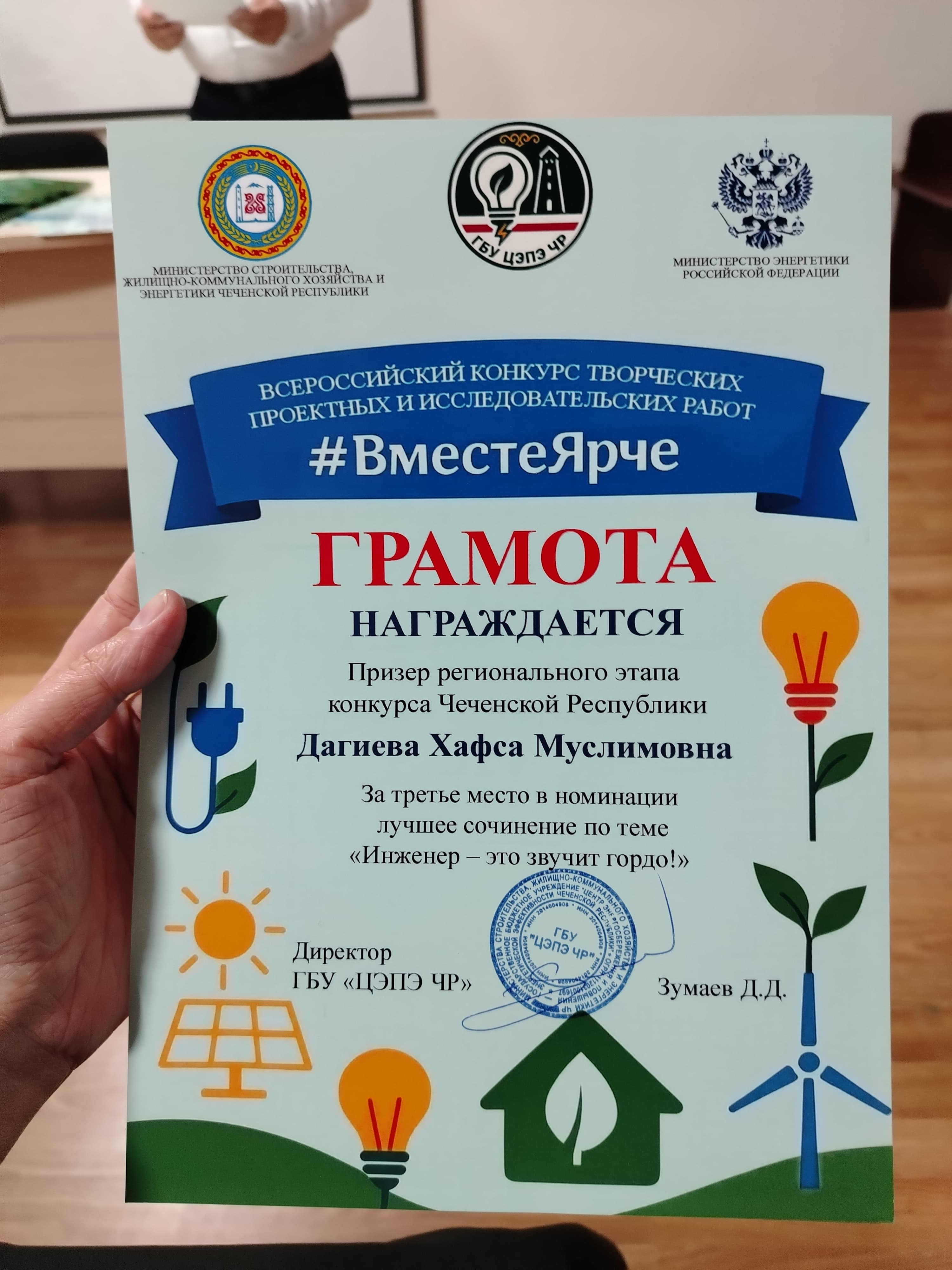 10.11.20256 ноября этого года в ГБУ «ЦЭПЭ ЧР» было проведено награждение победителей и призеров регионального этапа Всероссийского конкурса творческих, проектных и исследовательских работ учащихся «#ВместеЯрче». Конкурс проводился по номинациям:• рисунки по теме «Огни большого города» для 1-4 классов;• рисунки по теме «Мой атом» для 5-11 классов;• сочинения по теме «Инженер — это звучит гордо» для 5-11 классов.В конкурсе приняли участие 86 конкурсантов из которых были определены 3 победителя и 6 призеров.Призером в номинации «Сочинение «Инженер — это звучит гордо»» стала ученица 11 класса Дагиева Хафса!