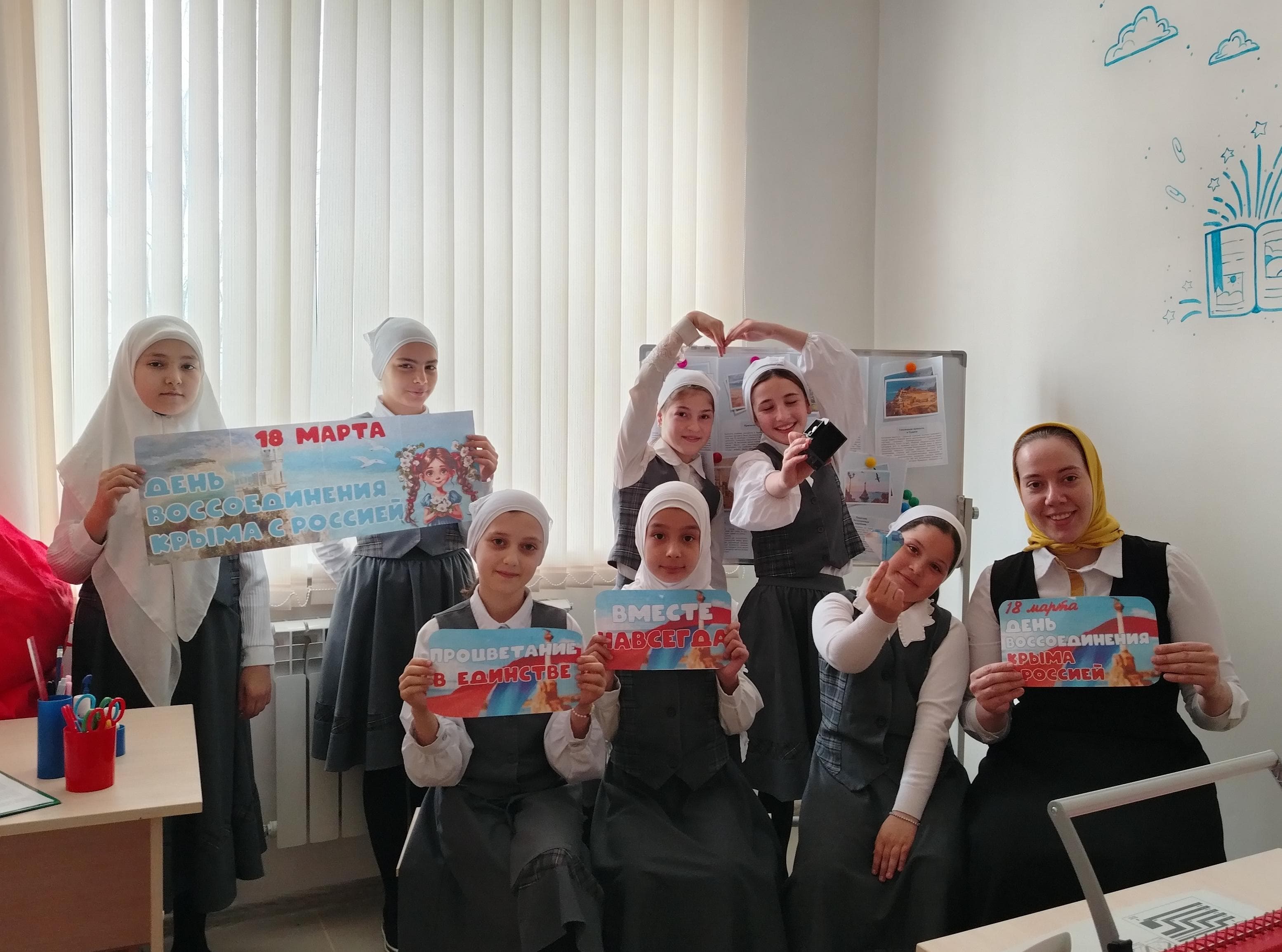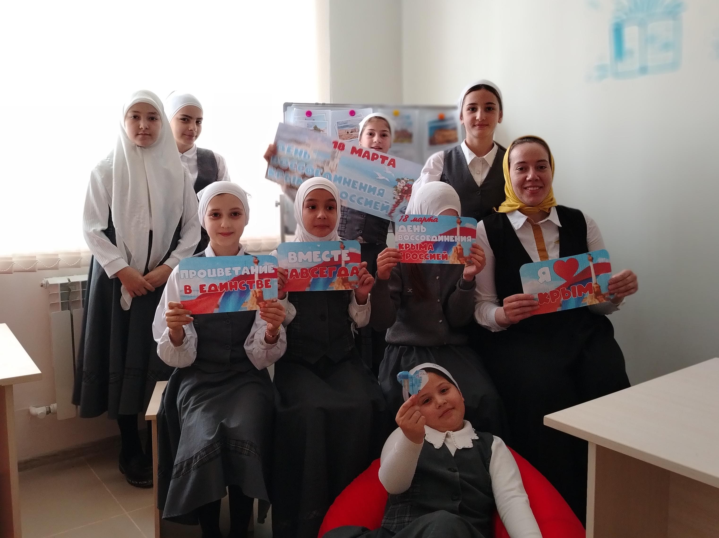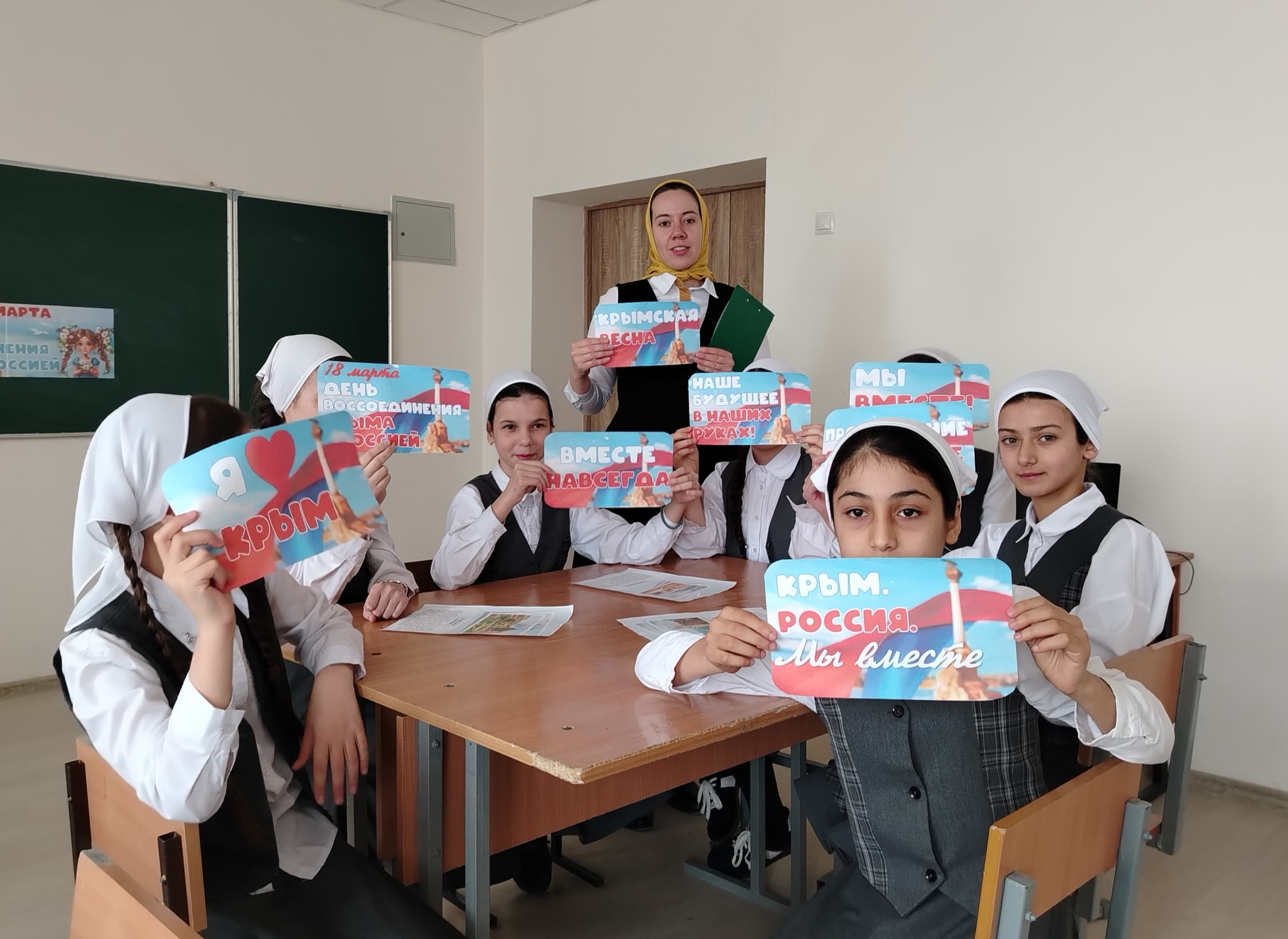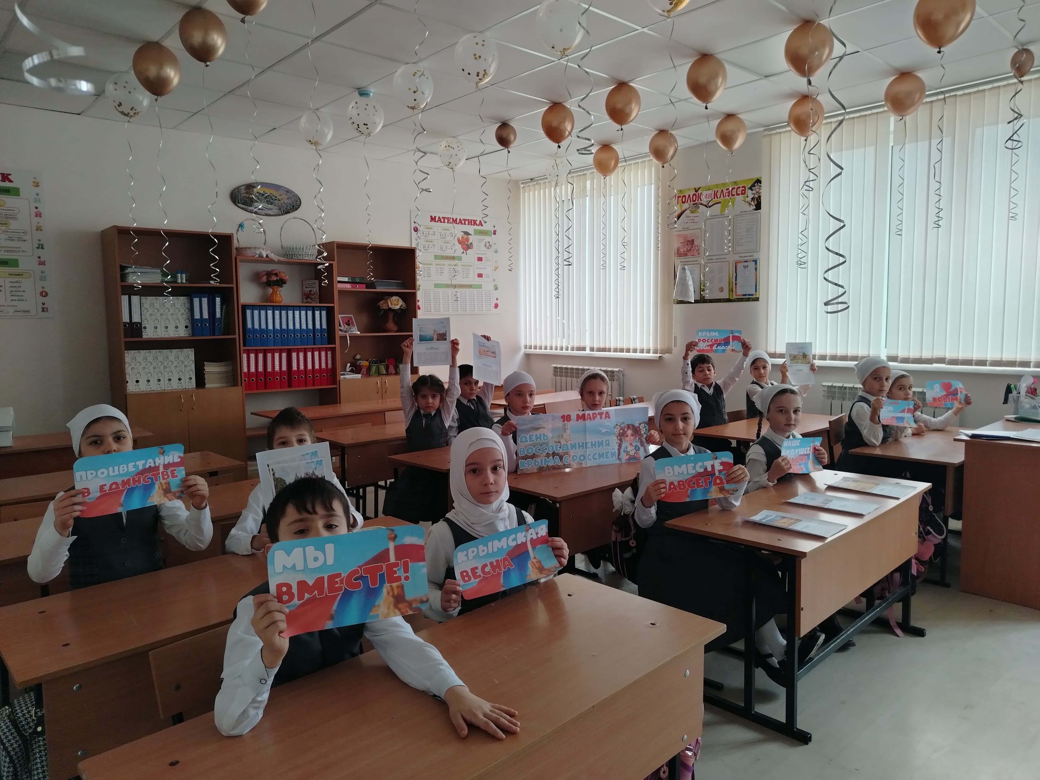 Под руководством советника директора по воспитанию и взаимодействию с детскими общественными объединениями Шахбиевой З.О-Х., совместно с классными руководителями 2-8 классов, были классные часы «Воссоединение Крыма с Россией» и интеллектуальные игры «Что ты знаешь о Крыме?»