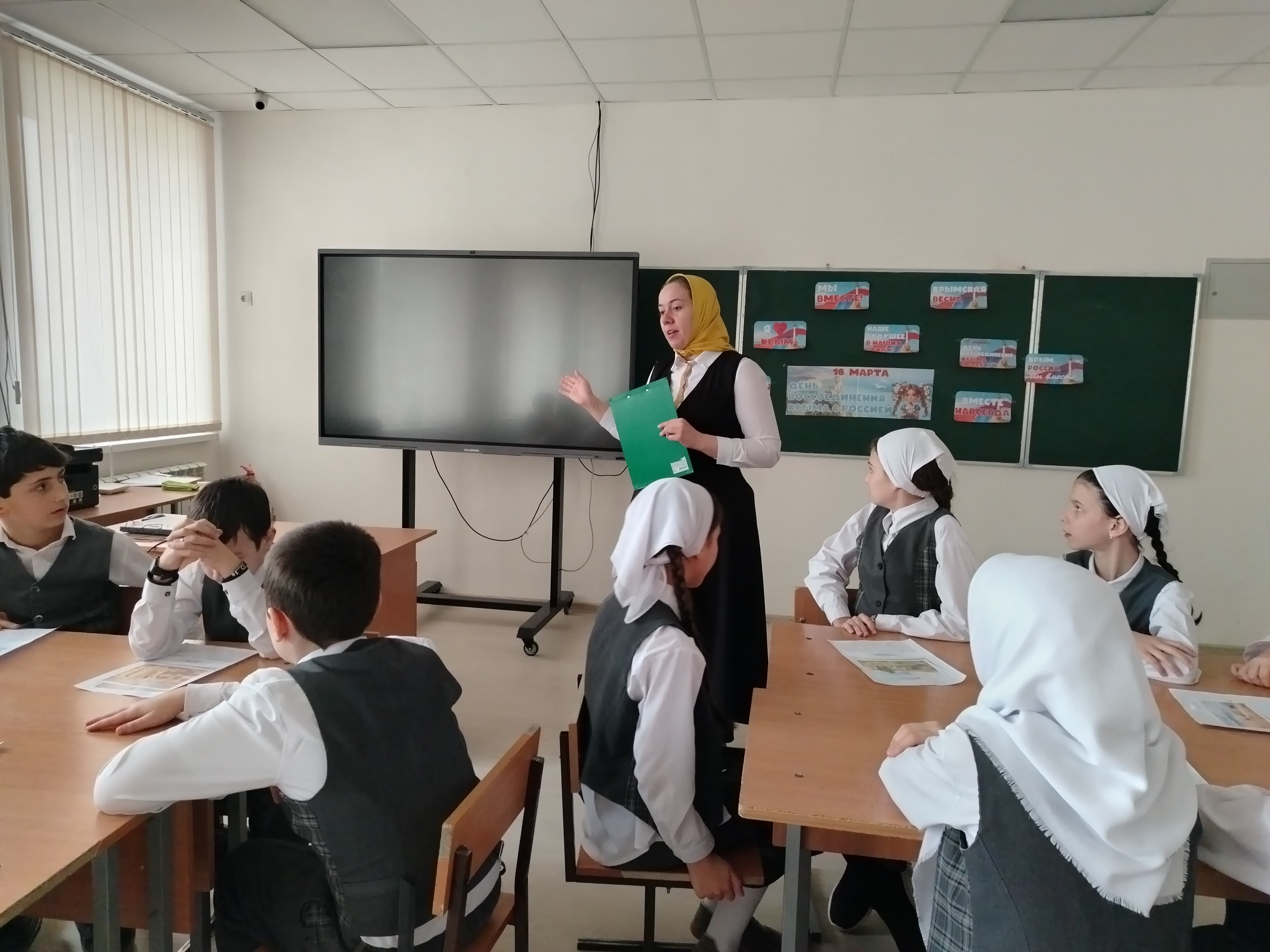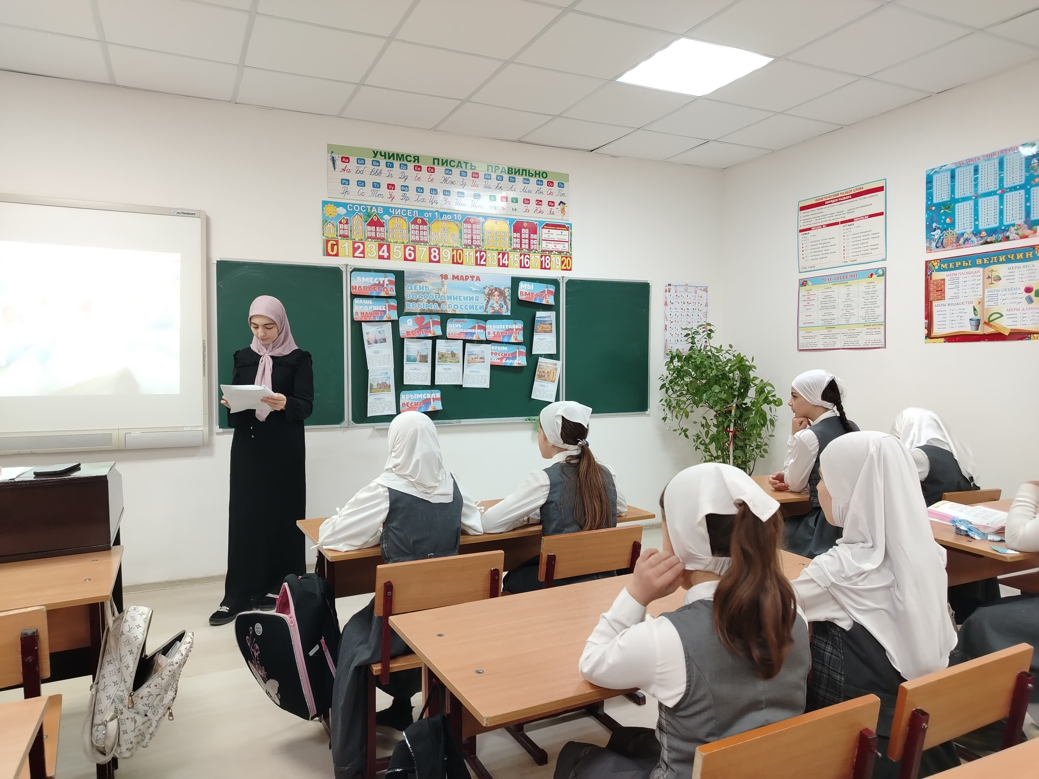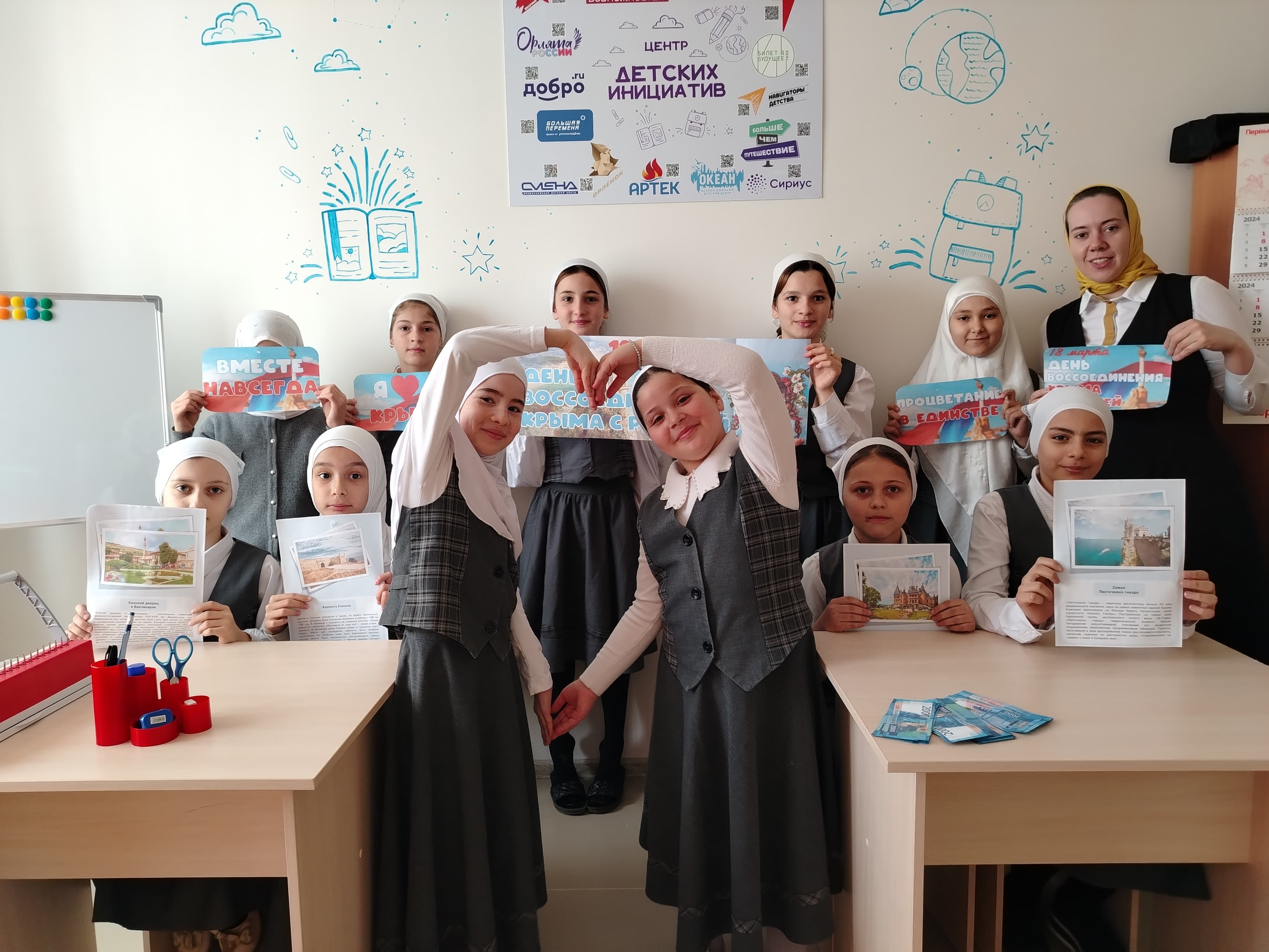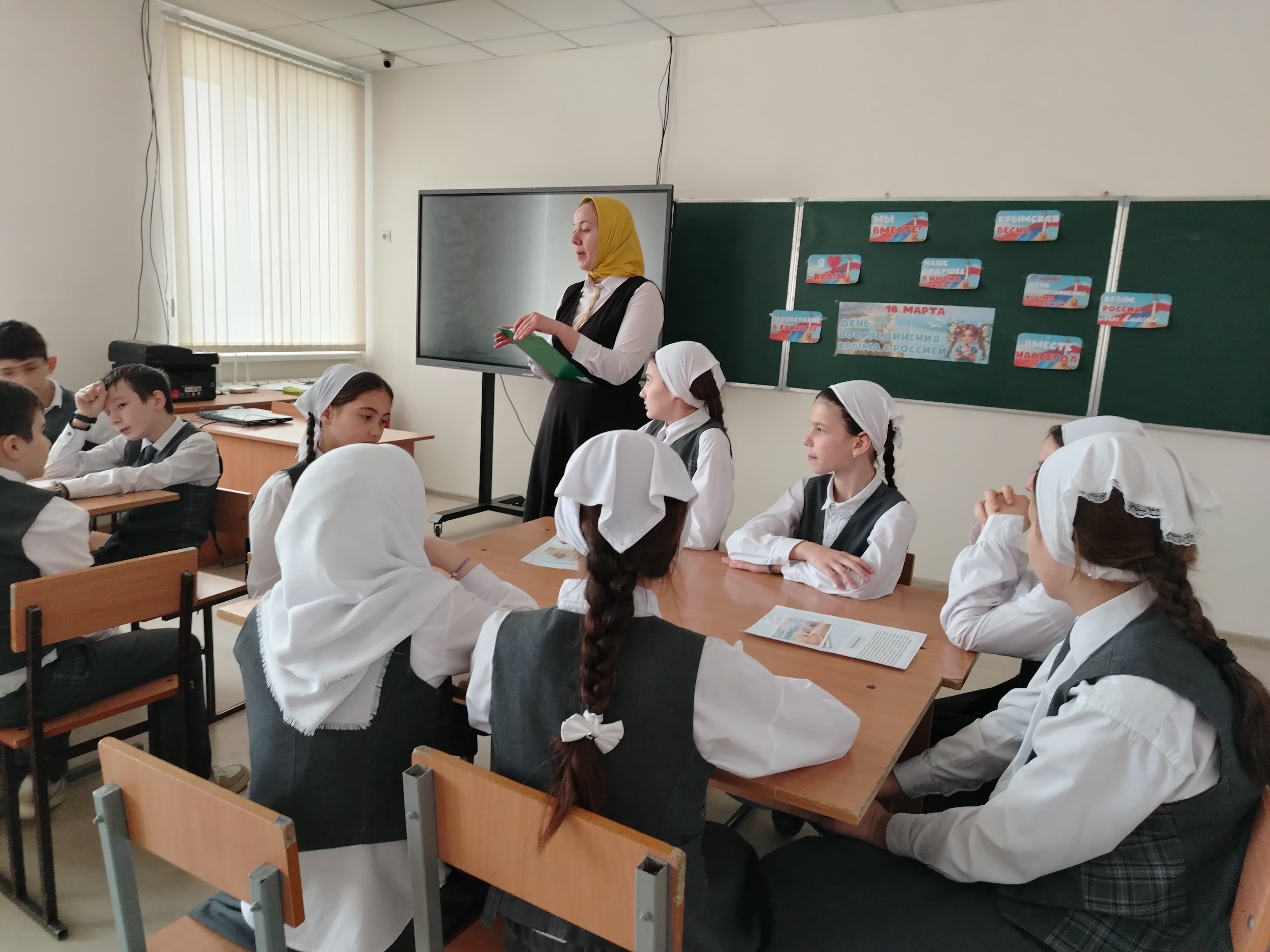 Под руководством советника директора по воспитанию и взаимодействию с детскими общественными объединениями Шахбиевой З.О-Х., совместно с классными руководителями 2-8 классов, были классные часы «Воссоединение Крыма с Россией» и интеллектуальные игры «Что ты знаешь о Крыме?»